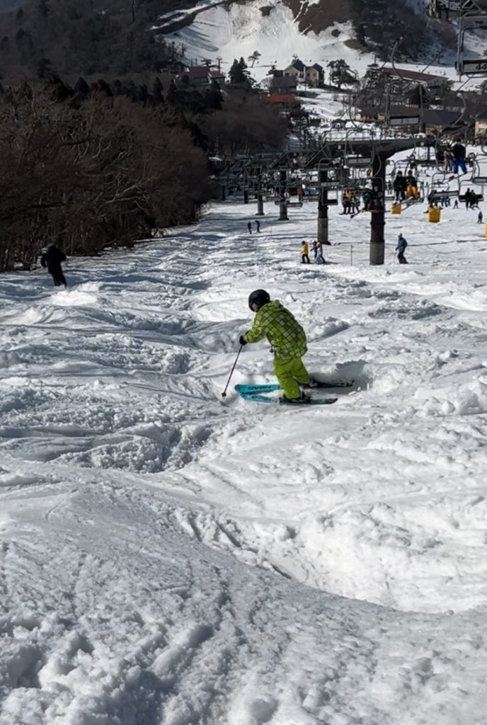 しかし、いざコブへ入ると身構えたりしてしまいますよね。連続滑走ではなく数コブずつコース横から出入りして良いポジションで慣れていきましょう。